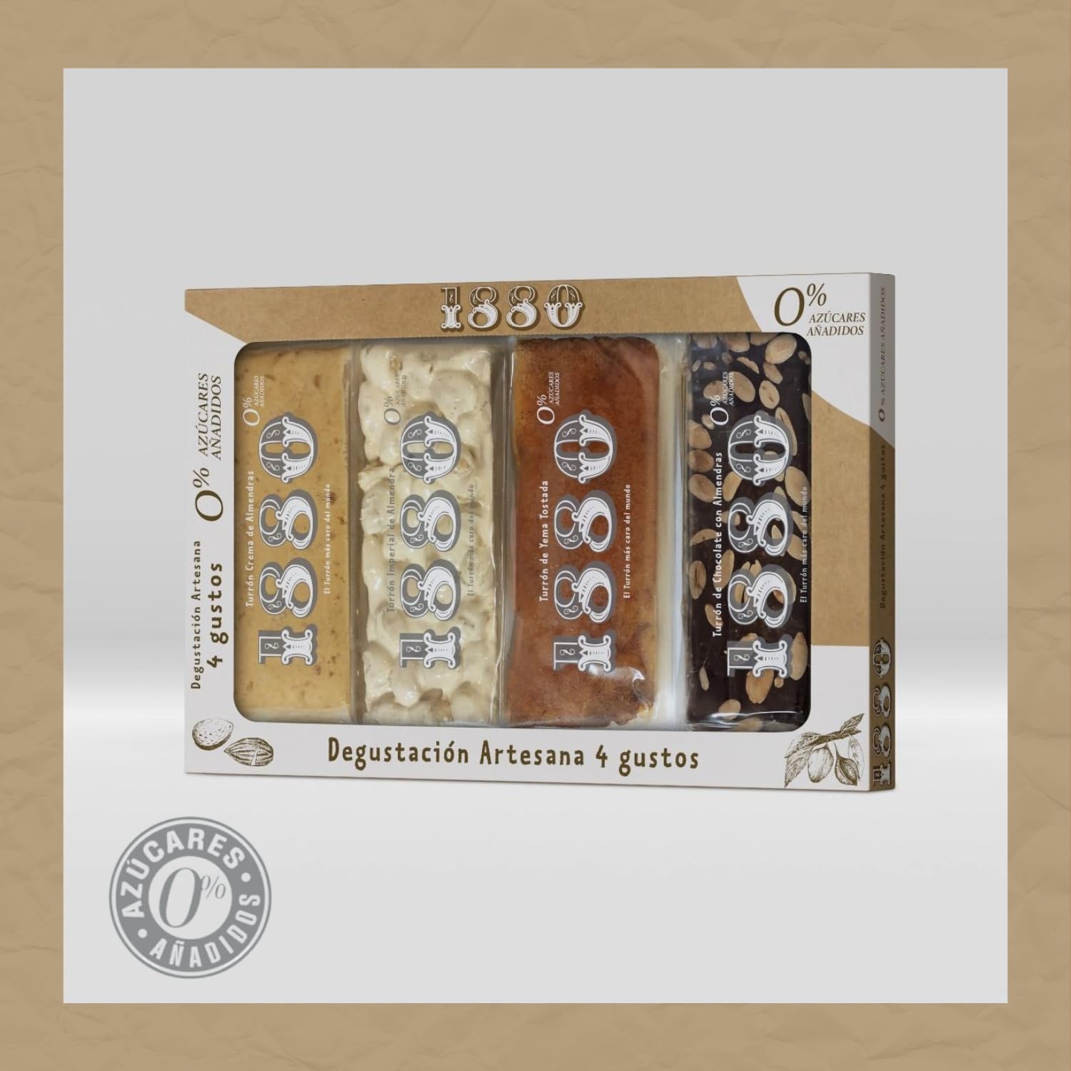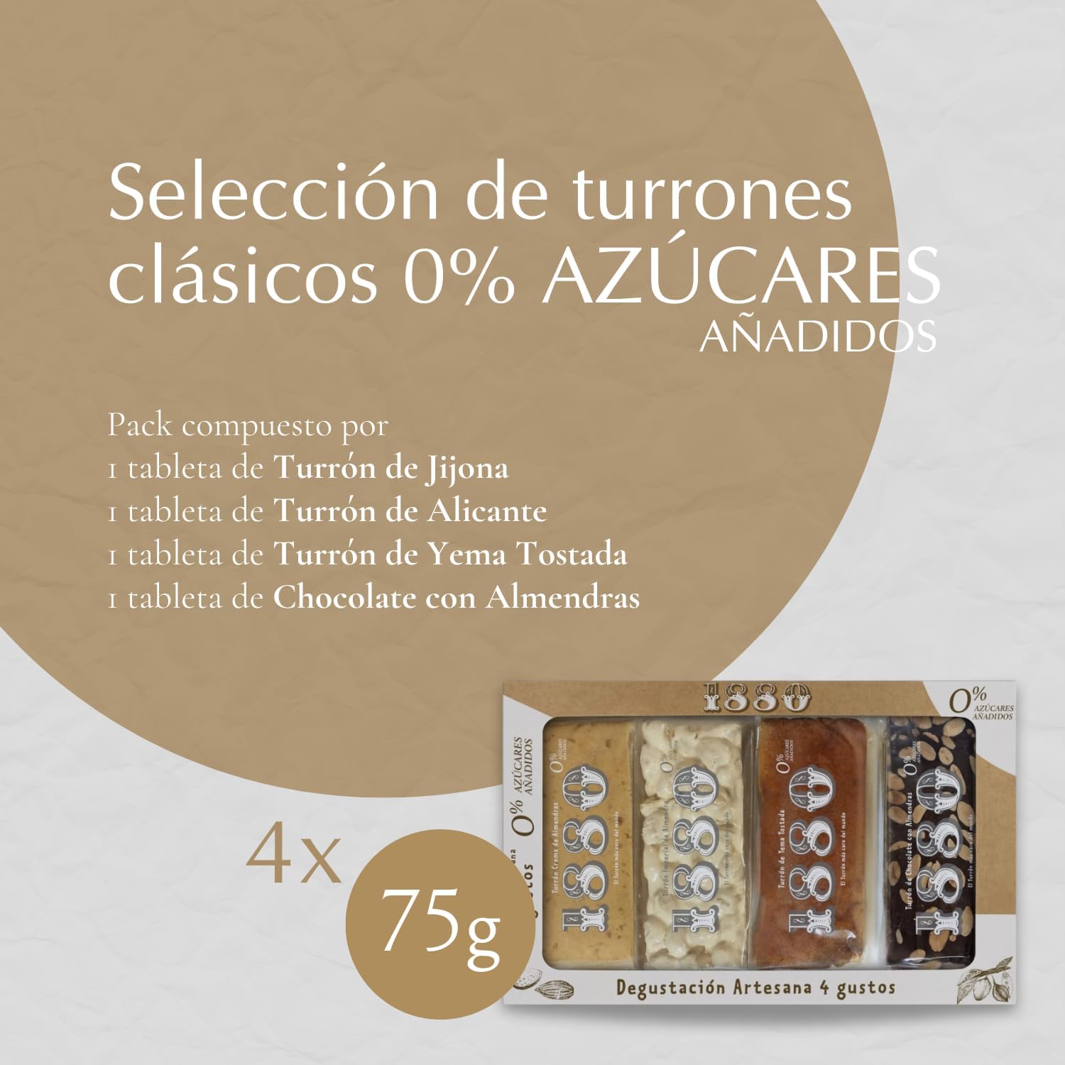 1880 – Degustación Turrones Artesana 4 Gustos 0% Azúcares Añadidos, Turrón de Crema, Turrón Imperial de Almendras, Turrón de Yema Tostada, Turrón de Chocolate con Almendras, 4 x 75g, Pack de 300g