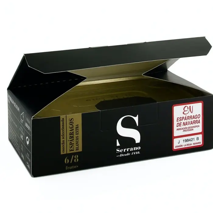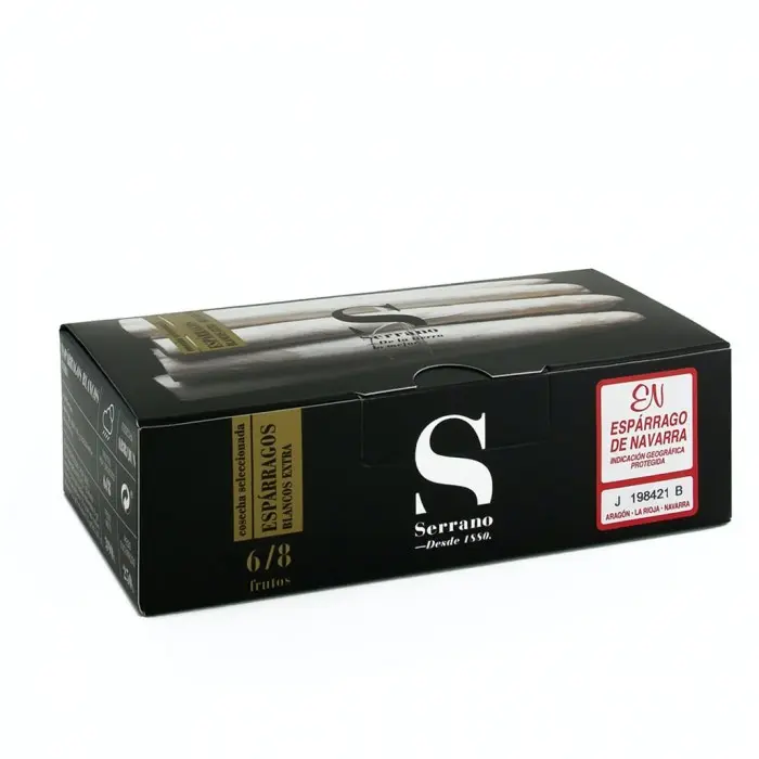 El espárrago Serrano Selección pelado a mano destaca por su coloración blanca, textura suave, nula fibrosidad y delicado sabor. Siempre con la garantía de calidad de la indicación geográfica protegida Espárrago de Navarra.