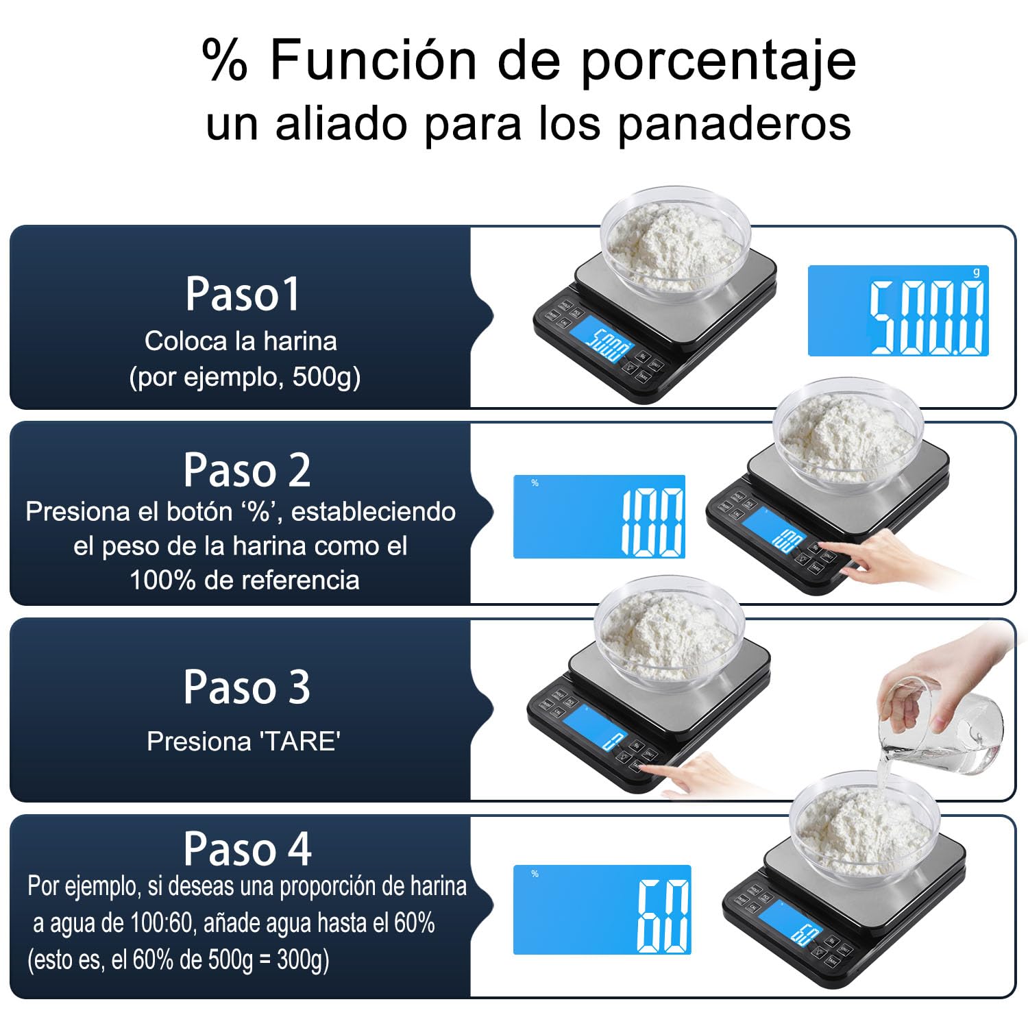 - [Alta precisión de 0.1g, múltiples funciones] Equipada con un sensor de alta calidad que ofrece una precisión de 0.1g y un rango de medición de 0.5g a 5kg. Incluye múltiples funciones: cálculo porcentual, tara, función HOLD, conversión de unidades, conteo, apagado automático(esta función puede ser configurada o cancelada), calibración, entre otras
