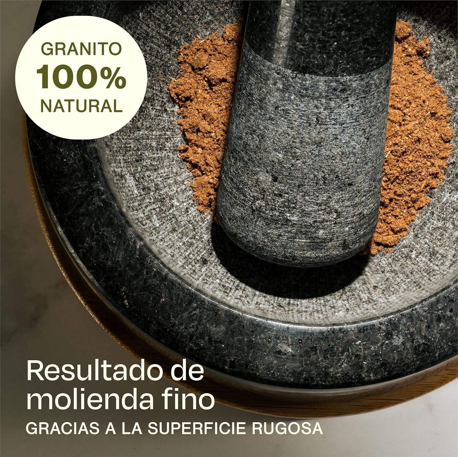 - Molienda Fina: La superficie rugosa del granito permite moler especias suaves y duras hasta obtener una consistencia sabrosa y uniforme.