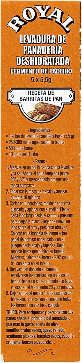 Royal Polvos para Hornear de Panadería Deshidratada, es el aliado imprescindible para lograr resultados excepcionales en tus creaciones al horno. Con su fórmula especial lograrás deliciosas masas caseras para pan, pizza, empanadas, brioche o bollería. Cada paquete de 27,5 gramos incluye 5 sobres de 5,5 gramos que equivalen a 15 gramos de polvos para hornear fresca. Los polvos para hornear de Panadería Royal asegura un horneado inmejorable por su capacidad de elevar las masas de manera uniforme. Con más de 150 años de tradición, Royal garantiza calidad y sabor en todos sus productos, ayudándote a crear momentos dulces y memorables. Indicaciones